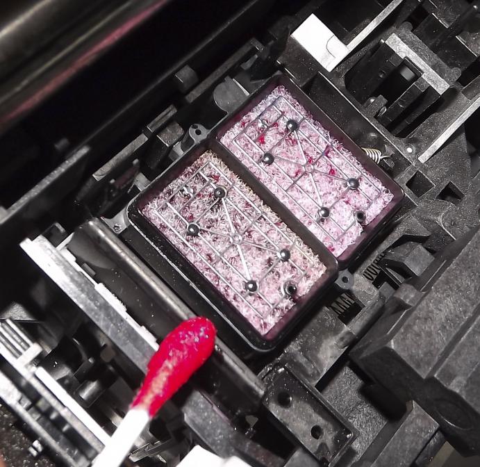 • Od spodu głowicy podłożyć szmatkę nasączoną płynem udrażniającym wewnętrznym (rys na obudowie drukarki)
